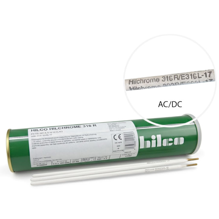 Hilchrome 316R E316L-17 2,5 mm ist eine Mehrzweck-Elektrode zum Schweißen von kohlenstoffarmen 17Cr12Ni3Mo austenitischen säurebeständig Edelstahlsorten wie AISI 316, 316L.