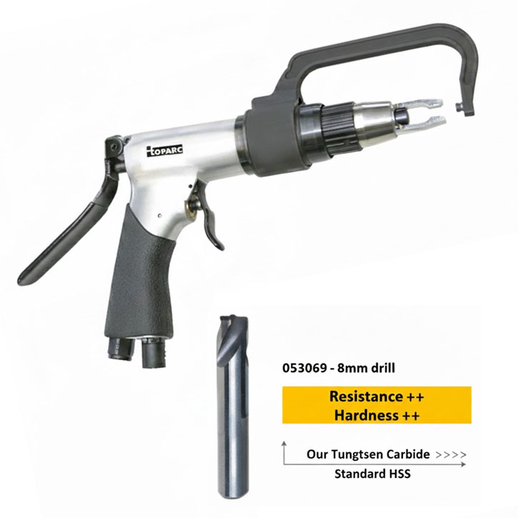 Der mit dem Druckluft Schweißpunktbohrer "Spot Drill" ausgelieferte 8 mm Bohrer besteht aus Wolframcarbid, das mit einer Härte von 600-800 HV wesentlich härter, als die zu bohrenden Stahlbleche ist. Eine spezielle Beschichtung sorgt zusätzlich für hohe Langlebigkeit, eine Härte von bis zu 3000 HV und einer hohen Temperaturbeständigkeit (bis 900 °C).