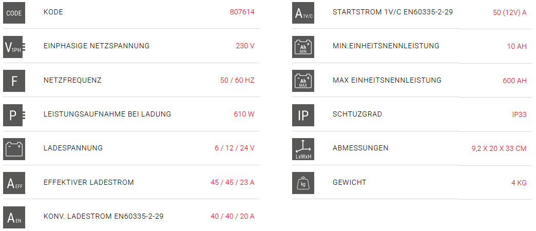 Startstrom 1V/C EN60335-2-29: 50 (12V) A