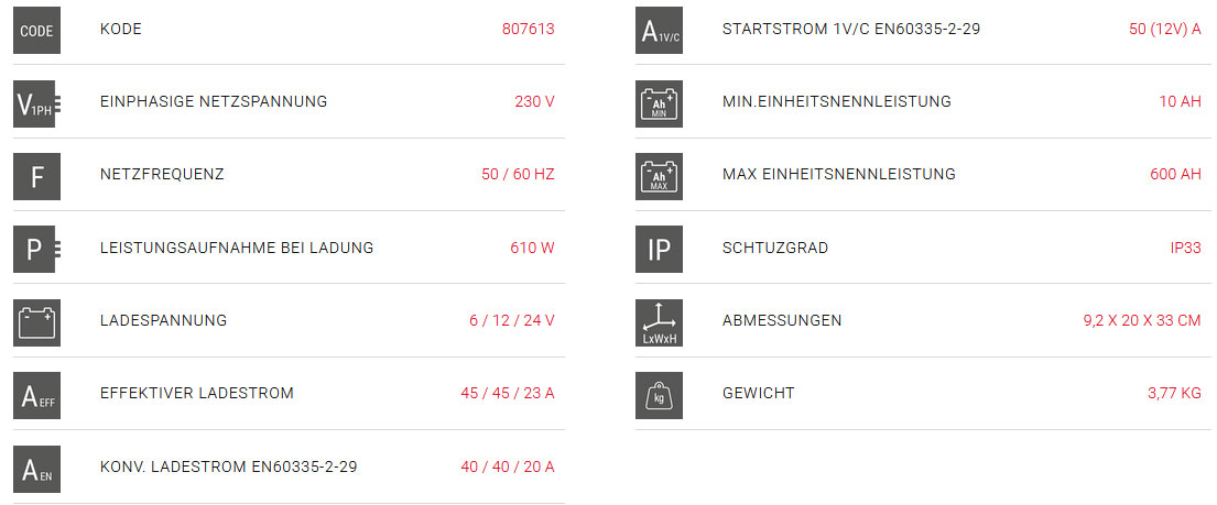 Die hohe Effizienz und die umfassende Kontrolle des Ladevorgangs führen zu erheblich kürzeren Ladezeiten und einer nachweislich längeren Batterielebensdauer. Das Gerät arbeitet mit den zuletzt getätigten Einstellungen (SMPS-Technologie) und bietet Schutz gegen Überlast, Kurzschluss und Verpolung.