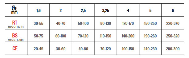 Telwin gibt eine Empfehlung des Schweißstroms, je nach Elektroden-Typ. Für Rutile (RT), basische (BS) und Cellulose (CE) Stabelektroden.