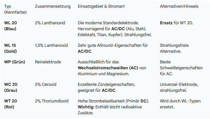 Generell gilt: WC-, WL- und WS-Elektroden sind die moderne, strahlungsfreie und leistungsstarke Alternative zu den veralteten WT-Elektroden und können universell für AC/DC eingesetzt werden.