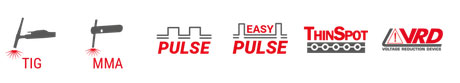 Schweißverfahren: TIG AC/DC (HF oder LIFT), TIG PULSE / EASY PULSE, MMA (DC)