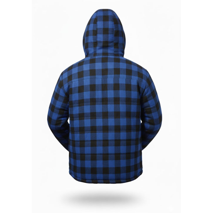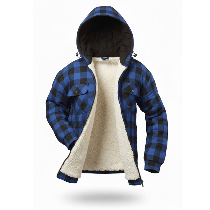Holzfällerjacke gefüttert mit Kapuze "Alberta" blau kariert. Marke: Craftland mit hochwertigem Webflanell und Teddyfutter.